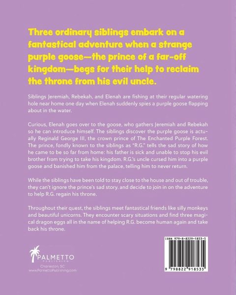 Three ordinary siblings embark on a fantastical adventure when a strange purple goose-the prince of a far-off kingdom-begs for their help to reclaim the throne from his evil uncle. Jeremiah, Rebekah, and Elenah are off to their regular watering hole to fish one day when suddenly, Elenah spies a purple goose flapping about in the water. The goose introduces himself as Reginald George III, the crown prince of a kingdom far away. He tells the siblings the sad story of how he came to be so far from home: his father is sick and unable to stop his evil brother from trying to take his kingdom. Reginald isn't even a goose at all-he's a human prince of the Enchanted Purple Forest! His uncle cursed him into the animal and banished him from the palace, telling him to never return. While the siblings have been told to stay close to the house and out of trouble, they couldn't ignore the prince's sad story. So, they decide to join in on the adventure to help Prince Reginald regain his throne. Throughout their quest, the siblings meet fantastical friends, encounter scary situations, and find three magical dragon eggs while helping Prince Reginald George become human again and take back his throne. The author has illustrated the book, infusing several relevant coloring pages into the narrative. The Adventure Of The Missing Dragon Eggsis the perfect read for any parents with multiple children who enjoy fantastic, mythical adventures. In addition, the unique group of magical friends introduced gives an added air of fun to the narrative.
