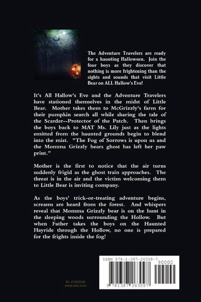 The Adventure Travelers have stationed themselves at Little Bear for their first years' Halloween in Master Adventure Trailer Ms. Lily. All Hallow's Eve begins at McGrizzly's farm where the older boys discover a section has been taped off with yellow caution tape. Inside the taped area is a paw print from Momma Grizzly's ghost, and from here the haunting facts and legends are shared by McGrizzly himself as the boys select a pumpkin for carving from his daughter, Lil' Meg's unusual patch. But when they return, Mother notices the air has changed. It is suddenly freezing cold and the roots of trees in the forest surrounding them are covered in a lighted fog known to the locals as the Fog of Sorrow. And from this point on the adventure turns from exciting to absolutely bone-chillingly frightening. Come along with the boys as their first haunted hayride reveals that even Father has a scare-limit.