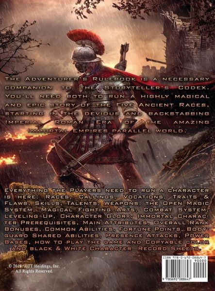 Great Art. Great Game System. Great Game! In The Adventurer's Rulebook, players will find all the rules, character generation, skill explanations, race, calling, vocations, open magic system, player major and minor fighting art powers and explanations, combat & tactics for the first through the seventh ages of game play, as well as color and black and white character record sheets for copying. The alternate game world draws on our history but adds five very special (and powerfully magical) ancient races, dragons, fey, and the evil demigod-like creatures called Marunes who try to destroy civilization. This book is companion to The Storyteller's Codex which holds more secret information the players should not know initially. If you are a player, having your own copy of this book is a MUST. If you are a Storyteller, then you should have this book in addition to The Storyteller's Codex. This is a brand new game system that is NOT watered down. It aims at those stalwart lovers of tabletop RPG games that allowed you to tweak characters in a variety of ways, all the while adding to rich character development and plot intrigue. The straightforward yet welcome complexity of the system, coupled with the backstabbing potential of devious political (even player vs. player) subterfuge (and powerful spells and dazzling swordplay and -- let's not forget -- sexy, powerful women) make our intended audience for this game a Mature audience. This game book covers all game play for five ancient races (Astorians (Ancient Romans), Arkadians (Celtic ancestors), Ammorians (Aegyptian/African ancestors), Oshekogans (ancient Chinese ancestors), and Atlanteans from the pre-historic era (The Beginnings) of the First Age, The Legends of the Second Age, the Power of the Third Age, the War of the Fourth Age, the Republican Era of the Fifth Age, the Imperial Era of the Sixth Age, and the magical explosion of the Seventh Age where the world is saturated with the magical Weave. The other three ages (the Dead World of the Eighth Age, the Cyber Age, and the Galactic Age) have their own book.