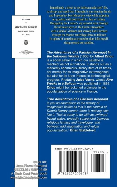 The Adventures Of A Parisian Aeronaut In The Unknown Worlds (1856) by Alfred Driou is a social satire in which our satellite is reached via hot air balloon. It stands out as a markedly anomalous literary item of his times, not merely for its imaginative extravagance, but also for its keen interest in technological progress. Predating Jules Verne whose Five Weeks in a Balloon was published in 1863, Driou might be reckoned a pioneer in the popularization of science in France. "The Adventures Of A Parisian Aeronaut is just as anomalous in the history of imaginative fiction as it is in the context of Driou's literary career; there is nothing else like it. That is partly to do with its awkward hybrid status, uneasily suspended between religious fantasy and travelogue, and between wild imagination and vulgar popularization." Brian Stableford.