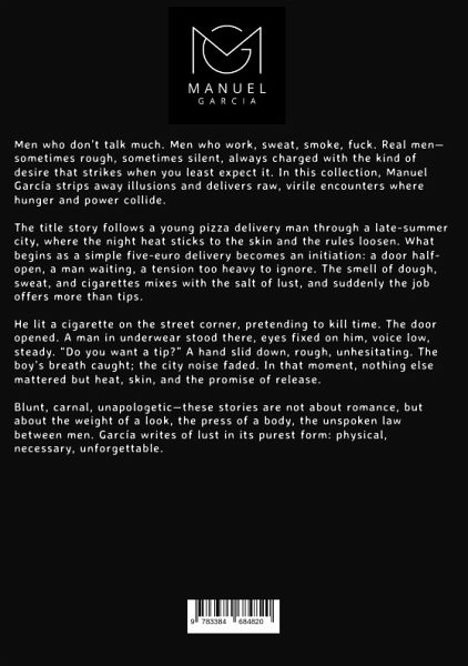 Men who don't talk much. Men who work, sweat, smoke, fuck. Real men-sometimes rough, sometimes silent, always charged with the kind of desire that strikes when you least expect it. In this collection, Manuel García strips away illusions and delivers raw, virile encounters where hunger and power collide.The title story follows a young pizza delivery man through a late-summer city, where the night heat sticks to the skin and the rules loosen. What begins as a simple five-euro delivery becomes an initiation: a door half-open, a man waiting, a tension too heavy to ignore. The smell of dough, sweat, and cigarettes mixes with the salt of lust, and suddenly the job offers more than tips.He lit a cigarette on the street corner, pretending to kill time. The door opened. A man in underwear stood there, eyes fixed on him, voice low, steady. "Do you want a tip?" A hand slid down, rough, unhesitating. The boy's breath caught; the city noise faded. In that moment, nothing else mattered but heat, skin, and the promise of release.Blunt, carnal, unapologetic-these stories are not about romance, but about the weight of a look, the press of a body, the unspoken law between men. García writes of lust in its purest form: physical, necessary, unforgettable.