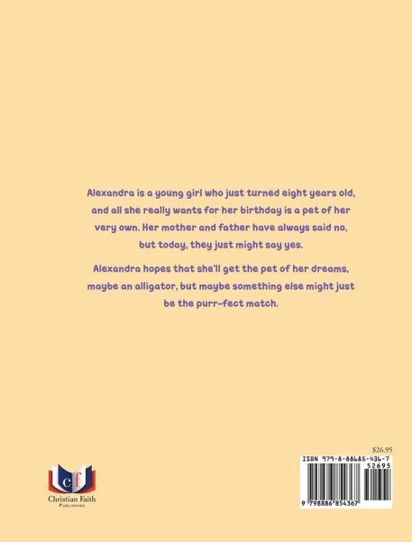 Alexandra is a young girl who just turned eight years old, and all she really wants for her birthday is a pet of her very own. Her mother and father have always said no, but today, they just might say yes. Alexandra hopes that she'll get the pet of her dreams, maybe an alligator, but maybe something else might just be the purr-fect match.