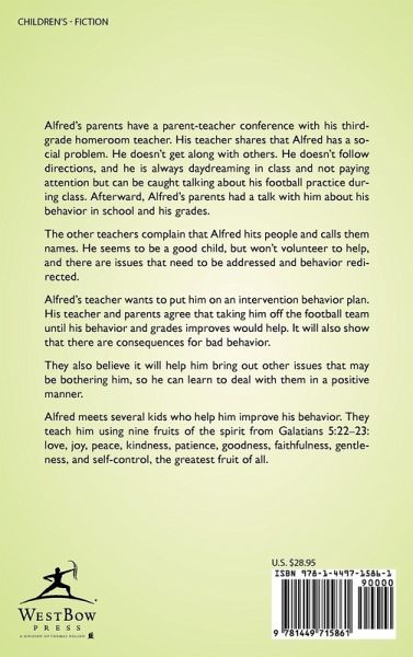 Alfred's parents have a parent-teacher conference with his third-grade homeroom teacher. His teacher shares that Alfred has a social problem. He doesn't get along with others. He doesn't follow directions, and he is always daydreaming in class and not paying attention but can be caught talking about his football practice during class. Afterward, Alfred's parents had a talk with him about his behavior in school and his grades. The other teachers complain that Alfred hits people and calls them names. He seems to be a good child, but won't volunteer to help, and there are issues that need to be addressed and behavior redirected. Alfred's teacher wants to put him on an intervention behavior plan. His teacher and parents agree that taking him off the football team until his behavior and grades improves would help. It will also show that there are consequences for bad behavior. They also believe it will help him bring out other issues that may be bothering him, so he can learn to deal with them in a positive manner. Alfred meets several kids who help him improve his behavior. They teach him using nine fruits of the spirit from Galatians 5:22-23: love, joy, peace, kindness, patience, goodness, faithfulness, gentleness, and self-control, the greatest fruit of all.