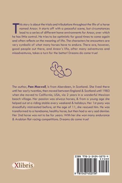 This story is about the trials and tribulations throughout the life of a horse named Anzor. It starts off with a peaceful scene, but circumstances lead to a series of different home environments for Anzor, over which he has little control. He tries to be optimistic for good times to come again and often reflects on the meaning of life. The characters he encounters are very symbolic of what many horses have to endure. There are, however, good people out there, and Anzor's life, after many adventures and misadventures, takes a turn for the better! Dreams do come true!