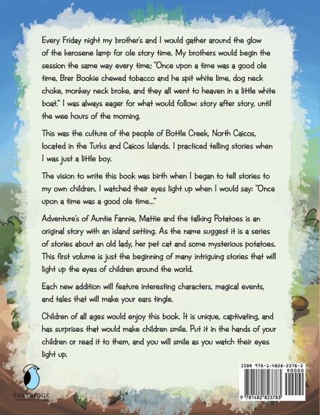 Every Friday night my brother's and I would gather around the glow of the kerosene lamp for ole story time. My brothers would begin the session the same way every time; "Once upon a time was a good ole time, Brer Bookie chewed tobacco and he spit white lime, dog neck choke, monkey neck broke, and they all went to heaven in a little white boat." I was always eager for what would follow: story after story, until the wee hours of the morning. This was the culture of the people of Bottle Creek, North Caicos, located in the Turks and Caicos Islands. I practiced telling stories when I was just a little boy. The vision to write this book was birth when I began to tell stories to my own children. I watched their eyes light up when I would say: "Once upon a time was a good ole time..." Adventure's of Auntie Fannie, Mattie and the talking Potatoes is an original story with an island setting. As the name suggest it is a series of stories about an old lady, her pet cat and some mysterious potatoes. This first volume is just the beginning of many intriguing stories that will light up the eyes of children around the world. Each new addition will feature interesting characters, magical events, and tales that will make your ears tingle. Children of all ages would enjoy this book. It is unique, captivating, and has surprises that would make children smile. Put it in the hands of your children or read it to them, and you will smile as you watch their eyes light up.