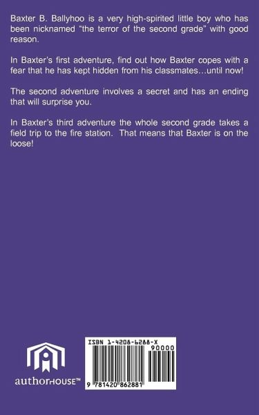 Baxter B. Ballyhoo is a very high-spirited little boy who has been nicknamed "the terror of the second grade" with good reason. In Baxter's first adventure, find out how Baxter copes with a fear that he has kept hidden from his classmates.until now! The second adventure involves a secret and has an ending that will surprise you. In Baxter's third adventure the whole second grade takes a field trip to the fire station. That means that Baxter is on the loose!