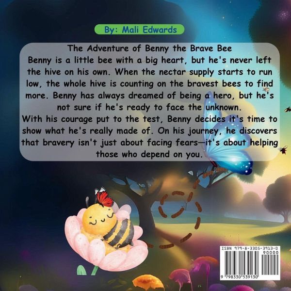 The Adventures of Benny the Brave Bee is an inspiring children's story that follows the journey of Benny, a little bee with a big heart. Benny may be small, but he is incredibly brave as he faces challenges, learns valuable lessons, and discovers the true meaning of courage and friendship. Through vibrant storytelling and fun adventures, young readers are encouraged to be brave, believe in themselves, and embrace their uniqueness. This uplifting tale empowers children to face their fears and shows them that true bravery comes from within. Key Features:Empowering message: Teaches children about bravery, self-confidence, and overcoming fears Engaging storyline: Benny's exciting adventures will captivate young readers and keep them inspired Colorful illustrations: Brings Benny's world to life with vibrant, fun, and engaging artwork Positive role models: Encourages children to believe in themselves and stand up for what is right Perfect for bedtime reading: A heartwarming story that parents and children can enjoy together Great for ages 4-8: Ideal for early readers or as a read-aloud storybook This delightful tale will leave a lasting impact on children, reminding them that they are braver than they believe and that even the smallest creature can make a big difference.