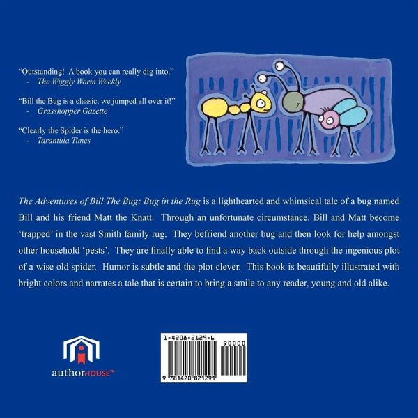 The Adventures of Bill The Bug: Bug in the Rug is a lighthearted and whimsical tale of a bug named Bill his friend Matt the Knatt. Through an unfortunate circumstance, Bill and Matt become 'trapped' in the vast Smith family rug. They befriend another bug and then look for help amongst other household 'pests'. They are finally able to find a way back outside through the ingenious plot of a wise old spider. Humor is subtle and the plot clever. This book is beautifully illustrated with bright colors and narrates a tale that is certain to bring a smile to any reader, young and old alike.
