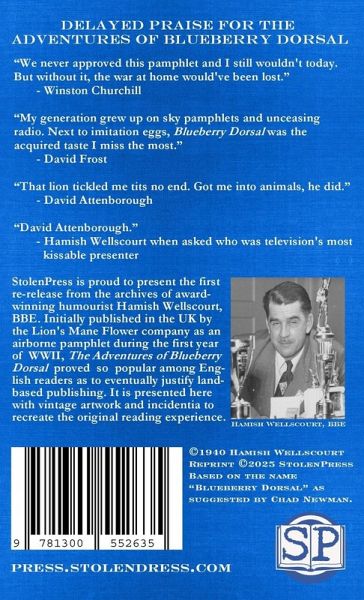 StolenPress is proud to present the first re-release from the archives of award-winning humourist Hamish Wellscourt, BBE. Initially published in the UK by the Lion's Mane Flower company as an airborne pamphlet during the first year of WWII, The Adventures of Blueberry Dorsal proved so popular among English readers as to eventually justify land-based publishing. It is presented here with vintage artwork and incidentia to recreate the original reading experience.
