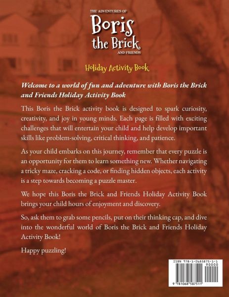 Boris the Brick is not your ordinary brick. His dreams are much bigger than being just another brick in the wall. Boris wants his freedom away from the 'Bricklayers Code' he is forced to live by and wants adventure. Boris is supported or discouraged by the other bricks he shares the wall with. The Adventures of Boris the Brick and Friends Book series features stories that teach valuable lessons about perseverance, friendship, and the importance of following one's dreams. Young readers will be captivated by the engaging storyline and the opportunity to actively participate by colouring pictures alongside the story. The interactive element ensures that your child remains engaged throughout. Welcome to a new world of fun and adventure with Boris the Brick and Friends Holiday Activity Book! This Boris the Brick Holiday Activity Book is designed to spark curiosity, creativity, and joy in young minds. Each page is filled with exciting challenges to entertain your child and help develop important skills like problem-solving, critical thinking, and patience. As your child embarks on this journey, remember that every activity is an opportunity for them to learn something new. Whether navigating a tricky maze, cracking a code, or finding hidden objects, each activity is a step towards becoming a puzzle master. We hope this Boris the Brick Holiday Activity Book brings your child hours of enjoyment and discovery. So, ask them to grab some pencils, put on their thinking cap, and dive into the wonderful world of Boris the Brick and Friends Holiday Activity Book!