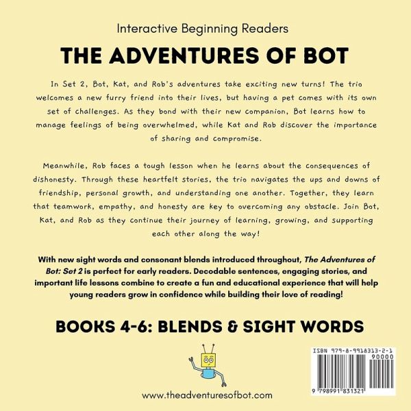 Are you having trouble finding books for your beginner reader that they can actually read and genuinely enjoy? It can be frustrating when those "level 1 readers" are either too challenging or simply not engaging enough, even when your child can sound out the words. Look no further than The Adventures of Bot! This series is designed to captivate young readers and make learning to read a fun adventure. Crafted by elementary educators, this interactive series is the perfect launching pad for beginner readers who have just mastered their letter sounds. Designed for busy parents and kids to enjoy together, each book features engaging narratives for adults paired with simple, decodable sentences for young readers. Many early reader books can either overwhelm children with complex words or bore them with overly simplistic plots. The Adventures of Bot bridges this gap by offering captivating stories that support literacy development AND encourage meaningful conversations-making it an ideal choice for a quick 15-minute bedtime story! Using a phonics approach, Set 2 builds confidence while introducing some consonant blends and four new sight words. Throughout Books 4-6, join Bot as he gets a new pet, learns the importance of sharing, and discovers why telling the truth always matters. Key Features:Engaging stories designed to spark conversations Simple, decodable words tailored for early readers A unique parent/child reading format that fosters bonding Ideal for busy parents looking for effective bedtime reading that supports literacy skills Inside "Set 2," you will find:Three delightful stories Four sight words (in addition to Set 1's sight words) Helpful tips for reading together Decodable text An introduction to consonant blends Charming illustrations that kids will adore Join Bot on his heartwarming adventures and watch your child's love for reading grow!