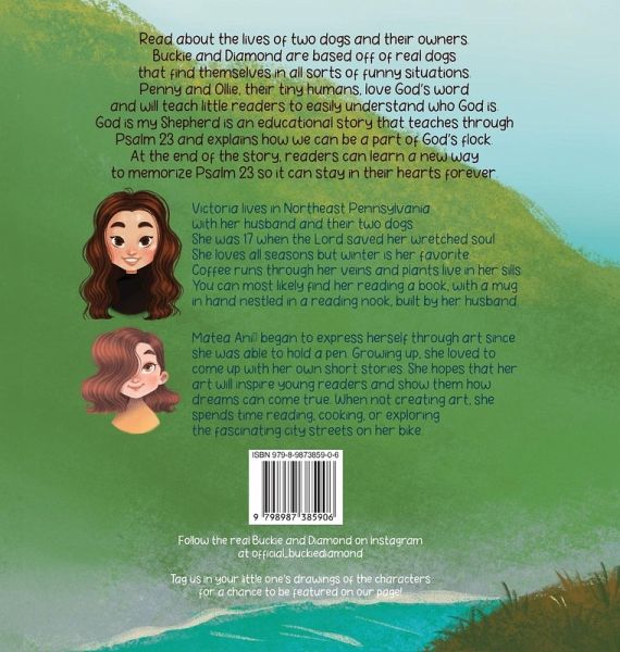 In The Adventures of Buckie and Diamond- God is my shepherd, a lost item is found and needs to be brought back to where it belongs... "'Buckie sniffled and said, "It was so sad and useless when we found it. Instead of rolling, it wobbled... instead of glittering in the sun, it clouded under the shadows... instead of....'" Meet Buckie and Diamond! Buckie is a Shichon who is playful, very bold and ready for anything. Diamond is a Cairn Terrier who will investigate all that life has to offer until of course, it's time for a nap. Penny and Ollie, their owners, love to learn about who God is. Penny is an intelligent girl whose feet never stop tapping and tutu never stops twirling. Ollie spends his days outside except when he's practicing his ninja moves on his older sister. Follow along as Penny teaches through Psalm 23. God is my shepherd explores what is means to follow God as our One True Shepherd. Little readers will also have a chance to learn how to memorize all of Psalm 23 through dance! Find out how Penny helps bring the lost item back to where it belongs just as a wandering sheep needs to be brought back to their shepherd.