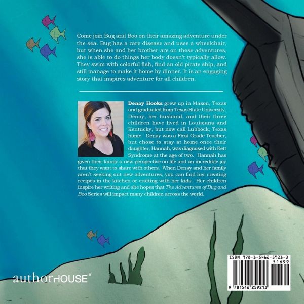 Come join Bug and Boo on their amazing adventure under the sea. Bug has a rare disease and uses a wheelchair, but when she and her brother are on these adventures, she is able to do things her body doesn't typically allow. They swim with colorful fish, find an old pirate ship, and still manage to make it home by dinner. It is an engaging story that inspires adventure for all children.