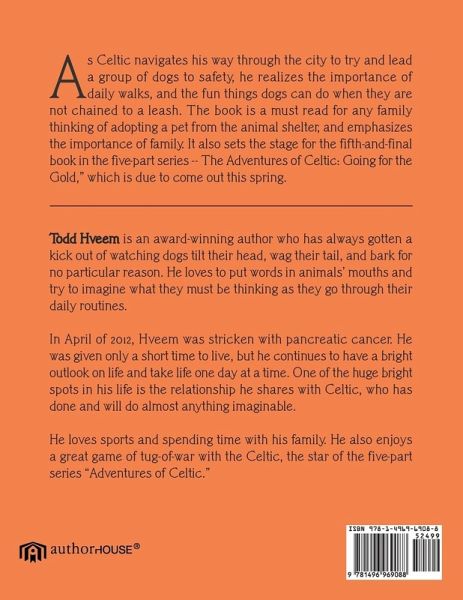 As Celtic navigates his way through the city to try and lead a group of dogs to safety, he realizes the importance of daily walks, and the fun things dogs can do when they are not chained to a leash. The book is a must read for any family thinking of adopting a pet from the animal shelter, and emphasizes the importance of family. It also sets the stage for the fifth-and-final book in the five-part series -- The Adventures of Celtic: Going for the Gold," which is due to come out this spring.