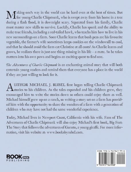 Making one's way in the world can be hard even at the best of times. But for young Charlie Chipmunk, who is swept away from his home in a tree during a flash flood, it is downright scary. Separated from his family, Charlie must master new skills to survive. Luckily, Charlie has spunk and the ability to make true friends, including a red-tailed hawk, who teachs him how to live in his new surroundings on a farm. Soon Charlie learns that bush peas are his favourite vegetable, the farmer's wife sometimes keeps cookies on the windowsill to cool, and that he should avoid the farm cat Christine at all costs! As Charlie learns and grows, he realizes there is just one thing missing in his life - a mate. So he takes matters into his own paws and begins an exciting quest to find one. The Adventures of Charlie Chipmunk is an enchanting animal story that will both entertain young readers and remind them that everyone has a place in the world if they are just willing to look for it.