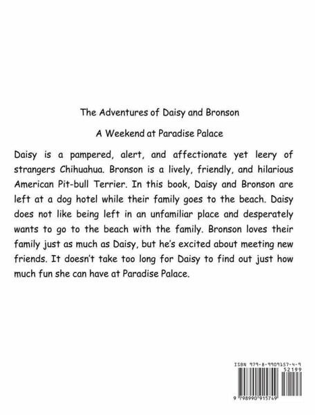 Daisy is a pampered, alert, and affectionate yet leery of strangers Chihuahua. Bronson is a lively, friendly, and hilarious American Pit-bull Terrier. In this book, Daisy and Bronson are left at a dog hotel while their family goes to the beach. Daisy does not like being left in an unfamiliar place and desperately wants to go to the beach with the family. Bronson loves their family just as much as Daisy, but he's excited about meeting new friends. It doesn't take too long for Daisy to find out just how much fun she can have at Paradise Palace.