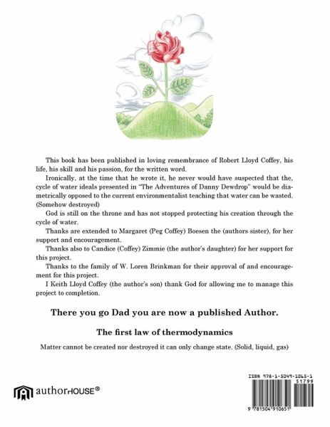 This book has been published in loving remembrance of Robert Lloyd Coffey, his life, his skill and his passion, for the written word. Ironically, at the time that he wrote it, he never would have suspected that the, cycle of water ideals presented in "The Adventures of Danny Dewdrop" would be diametrically opposed to the current environmentalist teaching that water can be wasted. (Somehow destroyed) God is still on the throne and has not stopped protecting his creation through the cycle of water. Thanks are extended to Margaret (Peg Coffey) Boesen the (authors sister), for her support and encouragement. Thanks also to Candice (Coffey) Zimmie (the author's daughter) for her support for this project. Thanks to the family of W. Loren Brinkman for their approval of and encouragement for this project. I Keith Lloyd Coffey (the author's son) thank God for allowing me to manage this project to completion. There you go Dad you are now a published Author. The first law of thermodynamics Matter cannot be created nor destroyed it can only change state. (Solid, liquid, gas)