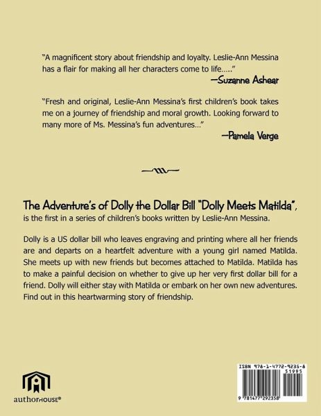 The Adventure's of Dolly the Dollar Bill "Dolly Meets Matilda", is the first in a series of children's books written by Leslie-Ann Messina. Dolly is a US dollar bill who leaves engraving and printing where all her friends are and departs on a heartfelt adventure with a young girl named Matilda. She meets up with new friends but becomes attached to Matilda. Matilda has to make a painful decision on whether to give up her very first dollar bill for a friend. Dolly will either stay with Matilda or embark on her own new adventures. Find out in this heartwarming story of friendship.