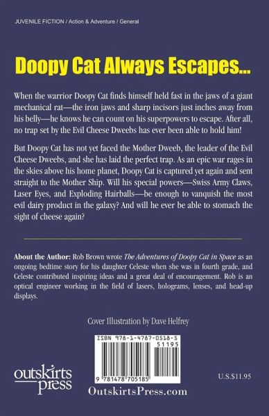 Doopy Cat Always Escapes... When the warrior Doopy Cat finds himself held fast in the jaws of a giant mechanical rat-the iron jaws and sharp incisors just inches away from his belly-he knows he can count on his superpowers to escape. After all, no trap set by the Evil Cheese Dweebs has ever been able to hold him! But Doopy Cat has not yet faced the Mother Dweeb, the leader of the Evil Cheese Dweebs, and she has laid the perfect trap. As an epic war rages in the skies above his home planet, Doopy Cat is captured yet again and sent straight to the Mother Ship. Will his special powers-Swiss Army Claws, Laser Eyes, and Exploding Hairballs-be enough to vanquish the most evil dairy product in the galaxy? And will he ever be able to stomach the sight of cheese again?