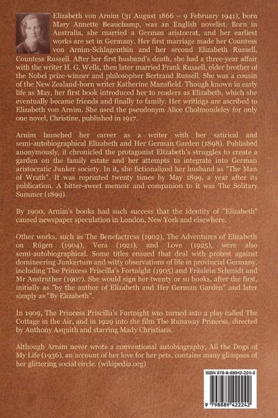 In 1901, the Countess von Arnim-Schlagenthin decides to go on a walking tour of Rugen, Germany's largest island off the Pomeranian coast. None of her friends want to go with her, so she decides to go alone, in a carriage instead of walking. She has an idea of writing a travel guide of the best inns on the island and best places to swim, etc. She accomplishes this (her gift of poetically describing nature's gifts is admirably suited to this task), but her tour of Rugen ends up being an adventure in every sense. She finds herself in the middle of a marital spat, having to think up a scheme to get the married couple back together and rid herself of their fighting, at the same time trying to avoid the company of a bishop's wife and her son who appear to be following her around the island. A delicious treat of lyrical beauty and witty observations by a unique voice that still brings delight to readers over 100 years later. (Chrystal) About Elizabeth von Arnim: Elizabeth von Arnim (31 August 1866 - 9 February 1941), born Mary Annette Beauchamp, was an English novelist. Born in Australia, she married a German aristocrat, and her earliest works are set in Germany. Her first marriage made her Countess von Arnim-Schlagenthin and her second Elizabeth Russell, Countess Russell. After her first husband's death, she had a three-year affair with the writer H. G. Wells, then later married Frank Russell, elder brother of the Nobel prize-winner and philosopher Bertrand Russell. She was a cousin of the New Zealand-born writer Katherine Mansfield. Though known in early life as May, her first book introduced her to readers as Elizabeth, which she eventually became friends and finally to family. Her writings are ascribed to Elizabeth von Arnim. She used the pseudonym Alice Cholmondeley for only one novel, Christine, published in 1917. Arnim launched her career as a writer with her satirical and semi-autobiographical Elizabeth and Her German Garden (1898). Published anonymously, it chronicled the protagonist Elizabeth's struggles to create a garden on the family estate and her attempts to integrate into German aristocratic Junker society. In it, she fictionalized her husband as "The Man of Wrath". It was reprinted twenty times by May 1899, a year after its publication. A bitter-sweet memoir and companion to it was The Solitary Summer (1899). By 1900, Arnim's books had such success that the identity of "Elizabeth" caused newspaper speculation in London, New York and elsewhere. Other works, such as The Benefactress (1902), The Adventures of Elizabeth on Rügen (1904), Vera (1921), and Love (1925), were also semi-autobiographical. Some titles ensued that deal with protest against domineering Junkertum and witty observations of life in provincial Germany, including The Princess Priscilla's Fortnight (1905) and Fräulein Schmidt and Mr Anstruther (1907). She would sign her twenty or so books, after the first, initially as "by the author of Elizabeth and Her German Garden" and later simply as "By Elizabeth". In 1909, The Princess Priscilla's Fortnight was turned into a play called The Cottage in the Air, and in 1929 into the film The Runaway Princess, directed by Anthony Asquith and starring Mady Christians. Although Arnim never wrote a conventional autobiography, All the Dogs of My Life (1936), an account of her love for her pets, contains many glimpses of her glittering social circle. (wikipedia.org)