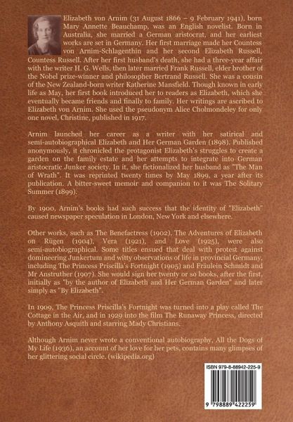In 1901, the Countess von Arnim-Schlagenthin decides to go on a walking tour of Rugen, Germany's largest island off the Pomeranian coast. None of her friends want to go with her, so she decides to go alone, in a carriage instead of walking. She has an idea of writing a travel guide of the best inns on the island and best places to swim, etc. She accomplishes this (her gift of poetically describing nature's gifts is admirably suited to this task), but her tour of Rugen ends up being an adventure in every sense. She finds herself in the middle of a marital spat, having to think up a scheme to get the married couple back together and rid herself of their fighting, at the same time trying to avoid the company of a bishop's wife and her son who appear to be following her around the island. A delicious treat of lyrical beauty and witty observations by a unique voice that still brings delight to readers over 100 years later. (Chrystal) About Elizabeth von Arnim: Elizabeth von Arnim (31 August 1866 - 9 February 1941), born Mary Annette Beauchamp, was an English novelist. Born in Australia, she married a German aristocrat, and her earliest works are set in Germany. Her first marriage made her Countess von Arnim-Schlagenthin and her second Elizabeth Russell, Countess Russell. After her first husband's death, she had a three-year affair with the writer H. G. Wells, then later married Frank Russell, elder brother of the Nobel prize-winner and philosopher Bertrand Russell. She was a cousin of the New Zealand-born writer Katherine Mansfield. Though known in early life as May, her first book introduced her to readers as Elizabeth, which she eventually became friends and finally to family. Her writings are ascribed to Elizabeth von Arnim. She used the pseudonym Alice Cholmondeley for only one novel, Christine, published in 1917. Arnim launched her career as a writer with her satirical and semi-autobiographical Elizabeth and Her German Garden (1898). Published anonymously, it chronicled the protagonist Elizabeth's struggles to create a garden on the family estate and her attempts to integrate into German aristocratic Junker society. In it, she fictionalized her husband as "The Man of Wrath". It was reprinted twenty times by May 1899, a year after its publication. A bitter-sweet memoir and companion to it was The Solitary Summer (1899). By 1900, Arnim's books had such success that the identity of "Elizabeth" caused newspaper speculation in London, New York and elsewhere. Other works, such as The Benefactress (1902), The Adventures of Elizabeth on Rügen (1904), Vera (1921), and Love (1925), were also semi-autobiographical. Some titles ensued that deal with protest against domineering Junkertum and witty observations of life in provincial Germany, including The Princess Priscilla's Fortnight (1905) and Fräulein Schmidt and Mr Anstruther (1907). She would sign her twenty or so books, after the first, initially as "by the author of Elizabeth and Her German Garden" and later simply as "By Elizabeth". In 1909, The Princess Priscilla's Fortnight was turned into a play called The Cottage in the Air, and in 1929 into the film The Runaway Princess, directed by Anthony Asquith and starring Mady Christians. Although Arnim never wrote a conventional autobiography, All the Dogs of My Life (1936), an account of her love for her pets, contains many glimpses of her glittering social circle. (wikipedia.org)