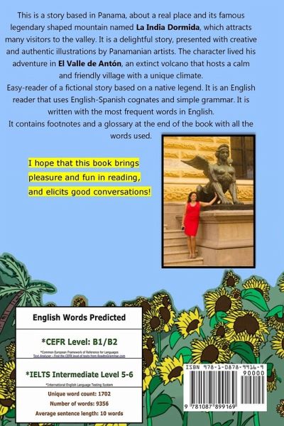 The Adventures of Enrique in Panama ("Las Aventuras de Enrique en Panamá" original title in Spanish) is a comprehensible input reader. This is an English easy reader for English students Level B1/B2. It is an adventure story that will take the readers to the beautiful scenery in Panama when an exchange student from an International School in Spain goes to Panama and learns about his family's historical past and its connection to the legend of a beautifully shaped mountain named "La India Dormida", which attracts many visitors to the valley. It is a delightful story, presented with creative and authentic illustrations by Panamanian artists. The character lived his adventure in "El Valle de Antón", an extinct volcano with a unique climate that hosts a calm and friendly village. Enrique is an upper school student who lives in the historical agricultural region of Andalusia, Spain. He attends an international school and works at his family's sunflower field business after school and on the weekends. He likes soccer and outdoor activities. Luckily for him, in his junior year, he had the opportunity to be part of a cultural exchange-travel program to go across the Atlantic Ocean to Panama. His best friend Beto joins him. They stay with two different host families. Enrique's host family lives and owns a hostal in "El Valle", and they have a daughter named Lily, who meets him at the airport in her Uber. There was an immediate connection between Lily and Enrique, which develops a friendship that continues beyond the legend of the mountain into the preservation of the trail. "La India Dormida" legendary trail and water springs offer Enrique an enchanted experience. Easy-reader of a fictional story based on a native legend. It is an English reader that uses English-Spanish cognates and simple grammar. It is written with the most frequent words in English. Not only that, but it contains footnotes and a glossary at the end of the book with all the words used. Specifications: ¿ Level B1/B2 CEFR ¿Intermediate Level 5-6 IELTS ¿High-frequency words plus many cognates ¿total unique word count: 1702 ¿59 pages of text ¿written mostly in the present tense ¿setting: Panama This is the English language and color version.