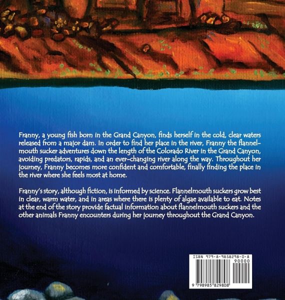 Franny, a young fish born in the Grand Canyon, finds herself in the cold, clear waters released from a major dam. In order to find her place in the river, Franny the flannelmouth sucker adventures down the length of the Colorado River in the Grand Canyon, avoiding predators, rapids, and an ever-changing river along the way. Throughout her journey, Franny becomes more confident and comfortable, finally finding the place in the river where she feels most at home. Franny's story, although fiction, is informed by science. Flannelmouth suckers grow best in clear, warm water, and in areas where there is plenty of algae available to eat. Notes at the end of the story provide factual information about flannelmouth suckers and the other animals Franny encounters during her journey throughout the Grand Canyon.