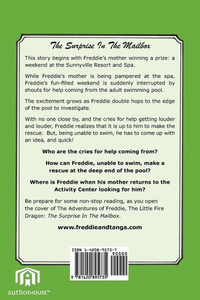 Other books written by the author, George Skudera, available for sale and those to be released soon from the 24 book series of The Adventures of Freddie, the Little Fire Dragon, are listed below directly following the Free Preview. Enjoy them all ! This story begins with Freddie's mother winning a prize: a weekend at the Sunnyville Resort and Spa. While Freddie's mother is being pampered at the spa, Freddie's fun-filled weekend is suddenly interrupted by shouts for help coming from the adult swimming pool. The excitement grows as Freddie double hops to the edge of the pool to investigate. With no one close by, and the cries for help getting louder and louder, Freddie realizes that it is up to him to make the rescue. But, being unable to swim, he has to come up with an idea, and quick! Who are the cries for help coming from? How can Freddie, unable to swim, make a rescue at the deep end of the pool? Where is Freddie when his mother returns to the Activity Center looking for him? Be prepare for some non-stop reading, as you open the cover of The Adventures of Freddie, The Little Fire Dragon: The Surprise In The Mailbox.