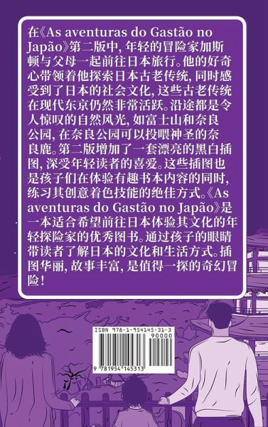 The Adventures of Gastão in Japan (Simplified Chinese) centers around Gastão, a young boy from Portugal who loves to travel with his parents, and he is excited to visit Japan. When they arrived, Gastão and his parents were struck by the contrast between the country's ancient traditions and its cutting-edge technology. They were quickly enveloped by the bustling city life of Tokyo, with its towering skyscrapers and flashing lights. But as they explored Japan, they also discovered pockets of calm and tranquility, such as serene gardens and temples. They were fascinated by the way that ancient customs were still very much a part of daily life, from the ceremonial tea ceremony to the ubiquitous kimonos. And they were amazed by the technological advances, from high-speed trains to robotic assistants. Gastão was rewarded with a rich experience that gave him a more profound understanding of Japanese society and culture. He is always eager to learn about different cultures and lifestyles, and he loves to share his own Portuguese culture with others. The Adventures of Gastão in Japan is sure to please young readers who want to learn about other countries and societies without having to leave their own backyard.