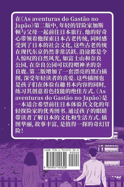 The Adventures of Gastão in Japan (Simplified Chinese) centers around Gastão, a young boy from Portugal who loves to travel with his parents, and he is excited to visit Japan. When they arrived, Gastão and his parents were struck by the contrast between the country's ancient traditions and its cutting-edge technology. They were quickly enveloped by the bustling city life of Tokyo, with its towering skyscrapers and flashing lights. But as they explored Japan, they also discovered pockets of calm and tranquility, such as serene gardens and temples. They were fascinated by the way that ancient customs were still very much a part of daily life, from the ceremonial tea ceremony to the ubiquitous kimonos. And they were amazed by the technological advances, from high-speed trains to robotic assistants. Gastão was rewarded with a rich experience that gave him a more profound understanding of Japanese society and culture. He is always eager to learn about different cultures and lifestyles, and he loves to share his own Portuguese culture with others. The Adventures of Gastão in Japan is sure to please young readers who want to learn about other countries and societies without having to leave their own backyard.