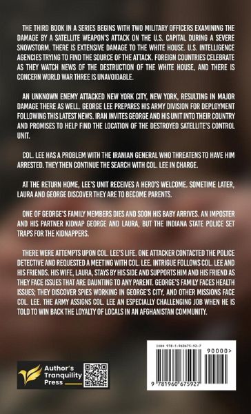 The third book in a series begins with two military officers examining the damage by a satellite weapon's attack on the U.S. capital during a severe snowstorm. There is extensive damage to the White House. U.S. intelligence agencies trying to find the source of the attack. Foreign countries celebrate as they watch news of the destruction of the White House, and there is concern World War Three is unavoidable.An unknown enemy attacked New York City, New York, resulting in major damage there as well. George Lee prepares his army division for deployment following this latest news. Iran invites George and his unit into their country and promises to help find the location of the destroyed satellite's control unit. Col. Lee has a problem with the Iranian general who threatens to have him arrested. They then continue the search with Col. Lee in charge.At the return home, Lee's unit receives a hero's welcome.Sometime later, Laura and George discover they are to become parents.One of George's family members dies and soon his baby arrives. An imposter and his partner kidnap George and Laura, but the Indiana State Police set traps for the kidnappers.There were attempts upon Col. Lee's life. One attacker contacted the police detective and requested a meeting with Col. Lee.Intrigue follows Col. Lee and his friends. His wife, Laura, stays by his side and supports him and his friend as they face issues that are daunting to any parent. George's family faces health issues; they discover spies working in George's city, and other missions face Col. Lee. The Army assigns Col. Lee an especially challenging job when he is told to win back the loyalty of locals in an Afghanistan community.