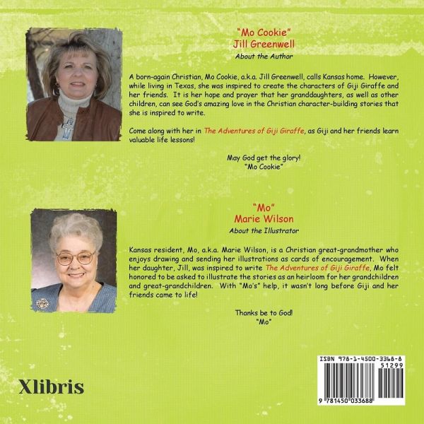 About the Author A born-again Christian, Mo Cookie, a.k.a. Jill (Wilson) Greenwell, calls El Dorado, Kansas, her home. However, while living in Justin, Texas, she was inspired to create the characters of Giji Giraffe and her friends. It is her hope and prayer that her granddaughters, as well as other children, can see God's amazing love in the Christian character-building stories that she is inspired to write. Come along with her in the Adventures of Giji Giraffe, as Giji and her friends learn valuable life lessons! Praying that God will shower you with many blessings! "Mo Cookie" About the Illustrator Kansas resident, Mo, a.k.a. Marie (Booth) Wilson, is a Christian great-grandmother who enjoys drawing and sending her illustrations as cards of encouragement. When her daughter, Jill, was inspired to write The Adventures of Giji Giraffe, Mo felt honored to be asked to illustrate the stories as an heirloom for her grandchildren and great-grandchildren. With "Mo's" help, it wasn't long before Giji and her friends came to life! May God richly bless you! "Mo"