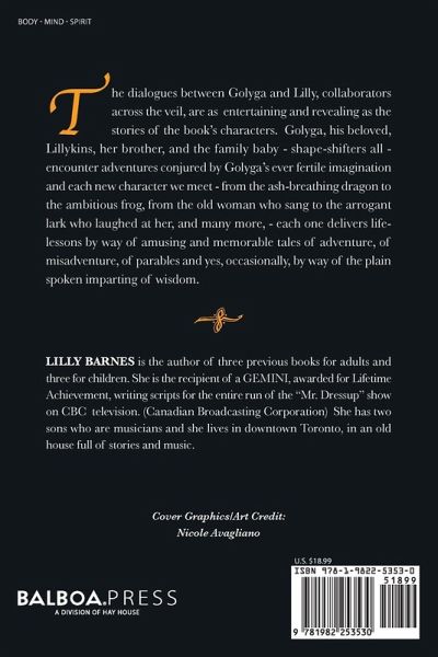 The dialogues between Golyga and Lilly, collaborators across the veil, are as entertaining and revealing as the stories of the book's characters. Golyga, his beloved, Lillykins, her brother, and the family baby - shape-shifters all - encounter adventures conjured by Golyga's ever fertile imagination and each new character we meet - from the ash-breathing dragon to the ambitious frog, from the old woman who sang to the arrogant lark who laughed at her, and many more, - each one delivers life-lessons by way of amusing and memorable tales of adventure, of misadventure, of parables and yes, occasionally, by way of the plain spoken imparting of wisdom.