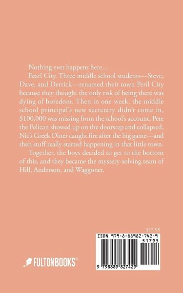 Nothing ever happens here... Pearl City. Three middle school students--Steve, Dave, and Derrick--renamed their town Peril City because they thought the only risk of being there was dying of boredom. Then in one week, the middle school principal's new secretary didn't come in, $100,000 was missing from the school's account, Pete the Pelican showed up on the doorstep and collapsed, Nic's Greek Diner caught fire after the big game--and then stuff really started happening in that little town. Together, the boys decided to get to the bottom of this, and they became the mystery-solving team of Hill, Anderson, and Waggoner.