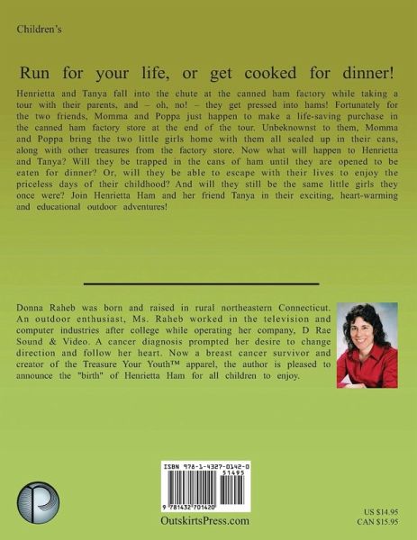 Run for your life, or get cooked for dinner! Henrietta and Tanya fall into the chute at the canned ham factory while taking a tour with their parents, and - oh, no! - they get pressed into hams! Fortunately for the two friends, Momma and Poppa just happen to make a life-saving purchase in the canned ham factory store at the end of the tour. Unbeknownst to them, Momma and Poppa bring the two little girls home with them all sealed up in their cans, along with other treasures from the factory store. Now what will happen to Henrietta and Tanya? Will they be trapped in the cans of ham until they are opened to be eaten for dinner? Or, will they be able to escape with their lives to enjoy the priceless days of their childhood? And will they still be the same little girls they once were? Join Henrietta Ham and her friend Tanya in their exciting, heart-warming and educational outdoor adventures!
