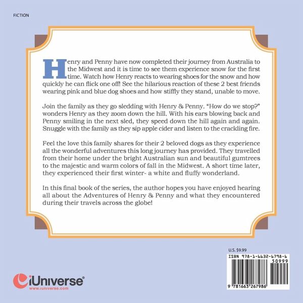 H enry and Penny have now completed their journey from Australia to the Midwest and it is time to see them experience snow for the first time. Watch how Henry reacts to wearing shoes for the snow and how quickly he can flick one off! See the hilarious reaction of these 2 best friends wearing pink and blue dog shoes and how stiffly they stand, unable to move. Join the family as they go sledding with Henry & Penny. "How do we stop?" wonders Henry as they zoom down the hill. With his ears blowing back and Penny smiling in the next sled, they speed down the hill again and again. Snuggle with the family as they sip apple cider and listen to the crackling fire. Feel the love this family shares for their 2 beloved dogs as they experience all the wonderful adventures this long journey has provided. They travelled from their home under the bright Australian sun and beautiful gumtrees to the majestic and warm colors of fall in the Midwest. A short time later, they experienced their first winter- a white and fluffy wonderland. In this final book of the series, the author hopes you have enjoyed hearing all about the Adventures of Henry & Penny and what they encountered during their travels across the globe!