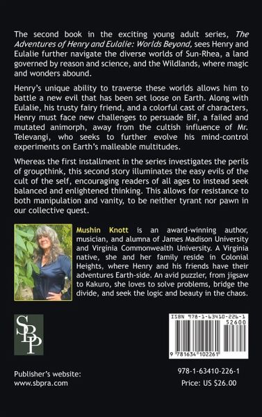 The second book in the exciting young adult series, The Adventures of Henry and Eulalie: Worlds Beyond, sees Henry and Eulalie further navigate the diverse worlds of Sun-Rhea, a land governed by reason and science, and the Wildlands, where magic and wonders abound. Henry's unique ability to traverse these worlds allows him to battle a new evil that has been set loose on Earth. Along with Eulalie, his trusty fairy friend, and a colorful cast of characters, Henry must face new challenges to persuade Bif, a failed and mutated animorph, away from the cultish influence of Mr. Televangi, who seeks to further evolve his mind-control experiments on Earth's malleable multitudes. Whereas the first installment in the series investigates the perils of groupthink, this second story illuminates the easy evils of the cult of the self, encouraging readers of all ages to instead seek balanced and enlightened thinking. This allows for resistance to both manipulation and vanity, to be neither tyrant nor pawn in our collective quest. About The Author: Mushin Knott is an award-winning author, musician, and alumna of James Madison University and Virginia Commonwealth University. A Virginia native, she and her family reside in Colonial Heights, where Henry and his friends have their adventures Earth-side. An avid puzzler, from jigsaw to Kakuro, she loves to solve problems, bridge the divide, and seek the logic and beauty in the chaos.
