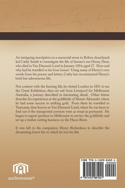 An intriguing inscription on a memorial stone in Bolton churchyard led Cathy Smith to investigate the life of farmer's son Henry Dent, who died in Van Diemen's Land in January 1854, aged 27. How and why had he travelled so far from home? Using many of Henry's own words from his poems and letters, Cathy has reconstructed Henry's brief but adventurous life. Not content with the farming life, he visited London in 1851 to see the Great Exhibition, then set sail from Liverpool for Melbourne Australia, a journey described in fascinating detail. Other letters describe his experiences at the goldfields of Mount Alexander where he had some success in striking gold. From there he travelled to Tasmania, then known as Van Diemen's Land, where he was keen to find out if the transported convicts were as venal as portrayed. He began to export produce to Melbourne to service the goldfields and set up a timber cutting business on the Huon River. It was left to his companion Henry Richardson to describe the devastating forest fire in which he lost his life.