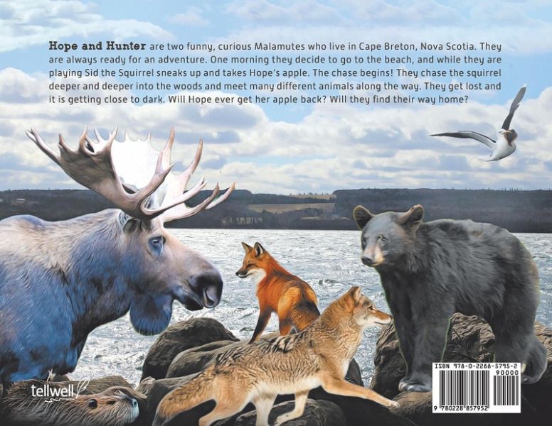 Hope and Hunter are two funny, curious Malamutes who live in Cape Breton, Nova Scotia. They are always ready for an adventure. One morning they decide to go to the beach, and while they are playing Sid the Squirrel sneaks up and takes Hope's apple. The chase begins! They chase the squirrel deeper and deeper into the woods and meet many different animals along the way. They get lost and it is getting close to dark. Will Hope ever get her apple back? Will they find their way home?
