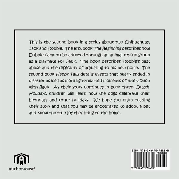 This is the second book in a series about two Chihuahuas, Jack and Dobbie. The first book The Beginning describes how Dobbie came to be adopted through an animal rescue group as a playmate for Jack. The book describes Dobbie's past abuse and the difficulty of adjusting to his new home. The second book Happy Tails details events that nearly ended in disaster as well as more light-hearted moments of interaction with Jack. As their story continues in book three, Doggie Holidays, children will learn how the dogs celebrate their birthdays and other holidays. We hope you enjoy reading their story and that you may be encouraged to adopt a pet and know the true joy they bring to the home.