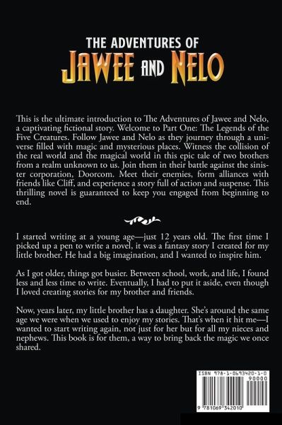 This is the ultimate introduction to The Adventures of Jawee and Nelo, a captivating fictional story. Welcome to Part One: The Legends of the Five Creatures. Follow Jawee and Nelo as they journey through a universe filled with magic and mysterious places. Witness the collision of the real world and the magical world in this epic tale of two brothers from a realm unknown to us. Join them in their battle against the sinister corporation, Doorcom. Meet their enemies, form alliances with friends like Cliff, and experience a story full of action and suspense. This thrilling novel is guaranteed to keep you engaged from beginning to end.