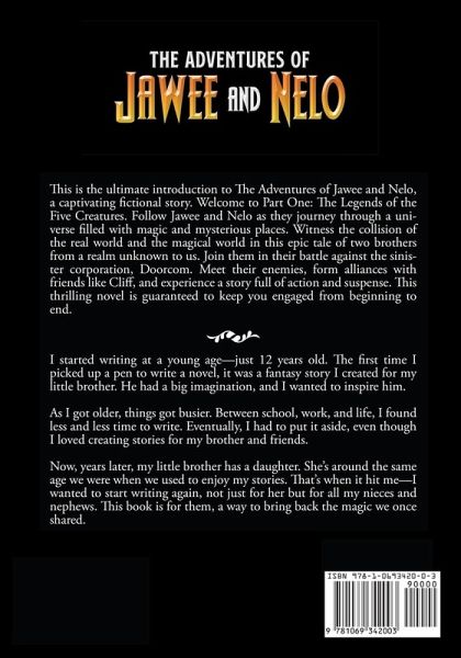 Welcome to the ultimate adventure! The Adventures of Jawee and Nelo: The Legends of the Five Creatures is the thrilling first chapter in an epic saga. Step into a universe where magic and mystery collide with reality, and follow two brothers from an unknown world as they embark on a quest unlike any other. When the ruthless corporation Doorcom threatens to unravel the balance between worlds, Jawee and Nelo must rise against the darkness. Along the way, they will encounter powerful allies like the fearless Cliff, battle formidable enemies, and uncover the secrets of the legendary Five Creatures. Packed with action, suspense, and heart-pounding twists, this is more than just a story-it's an adventure that will leave you breathless. Are you ready to enter the unknown?