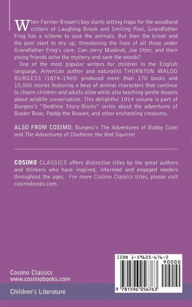 When Farmer Brown's boy starts setting traps for the woodland critters of Laughing Brook and Smiling Pool, Grandfather Frog has a scheme to save the animals. But then the brook and the pool start to dry up, threatening the lives of all those under Grandfather Frog's care. Can Jerry Muskrat, Joe Otter, and their young friends solve the mystery and save the woods? One of the most popular writers for children in the English language, American author and naturalist THORNTON WALDO BURGESS (1874-1965) produced more than 170 books and 15,000 stories featuring a bevy of animal characters that continue to charm children and adults alike while also teaching gentle lessons about wildlife conservation. This delightful 1914 volume is part of Burgess's "Bedtime Story-Books" series about the adventures of Buster Bear, Paddy the Beaver, and other enchanting creatures. ALSO FROM COSIMO: Burgess's The Adventures of Bobby Coon and The Adventures of Chatterer the Red Squirrel