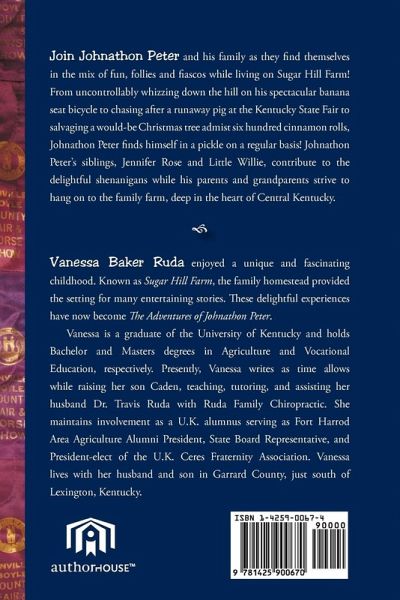 Join Johnathon Peter and his family as they find themselves in the mix of fun, follies and fiascos while living on Sugar Hill Farm! From uncontrollably whizzing down the hill on his spectacular banana seat bicycle to chasing after a runaway pig at the Kentucky State Fair to salvaging a would-be Christmas tree admist six hundred cinnamon rolls, Johnathon Peter finds himself in a pickle on a regular basis! Johnathon Peter's siblings, Jennifer Rose and Little Willie, contribute to the delightful shenanigans while his parents and grandparents strive to hang on to the family farm, deep in the heart of Central Kentucky.
