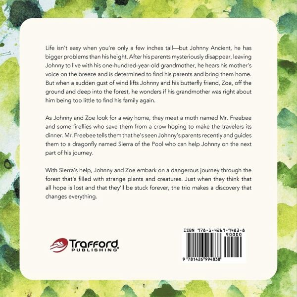 Life isn't easy when you're only a few inches tall-but Johnny Ancient, he has bigger problems than his height. After his parents mysteriously disappear, leaving Johnny to live with his one-hundred-year-old grandmother, he hears his mother's voice on the breeze and is determined to find his parents and bring them home. But when a sudden gust of wind lifts Johnny and his butterfly friend, Zoe, off the ground and deep into the forest, he wonders if his grandmother was right about him being too little to find his family again. As Johnny and Zoe look for a way home, they meet a moth named Mr. Freebee and some fireflies who save them from a crow hoping to make the travelers its dinner. Mr. Freebee tells them that he's seen Johnny's parents recently and guides them to a dragonfly named Sierra of the Pool who can help Johnny on the next part of his journey. With Sierra's help, Johnny and Zoe embark on a dangerous journey through the forest that's filled with strange plants and creatures. Just when they think that all hope is lost and that they'll be stuck forever, the trio makes a discovery that changes everything.