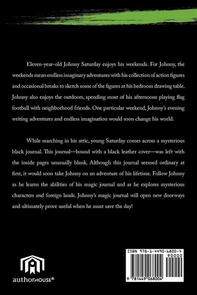 Eleven-year-old Johnny Saturday enjoys his weekends. For Johnny, the weekends mean endless imaginary adventures with his collection of action figures and occasional breaks to sketch some of the figures at his bedroom drawing table. Johnny also enjoys the outdoors, spending most of his afternoons playing flag football with neighborhood friends. One particular weekend, Johnny's evening writing adventures and endless imagination would soon change his world. While searching in his attic, young Saturday comes across a mysterious black journal. This journal-bound with a black leather cover-was left with the inside pages unusually blank. Although this journal seemed ordinary at first, it would soon take Johnny on an adventure of his lifetime. Follow Johnny as he learns the abilities of his magic journal and as he explores mysterious characters and foreign lands. Johnny's magic journal will open new doorways and ultimately prove useful when he must save the day!