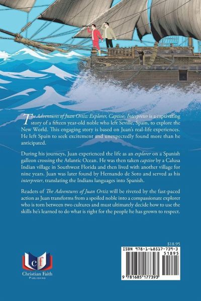 The Adventures of Juan Ortiz: Explorer, Captive, Interpreter is a captivating story of a fifteen year-old noble who left Seville, Spain, to explore the New World. This engaging story is based on Juan's real-life experiences. He left Spain to seek excitement and unexpectedly found more than he anticipated. During his journeys, Juan experienced the life as an explorer on a Spanish galleon crossing the Atlantic Ocean. He was then taken captive by a Calusa Indian village in Southwest Florida and then lived with another village for nine years. Juan was later found by Hernando de Soto and served as his interpreter, translating the Indians languages into Spanish. Readers of The Adventures of Juan Ortiz will be riveted by the fast-paced action as Juan transforms from a spoiled noble into a compassionate explorer who is torn between two cultures and must ultimately decide how to use the skills he's learned to do what is right for the people he has grown to respect.