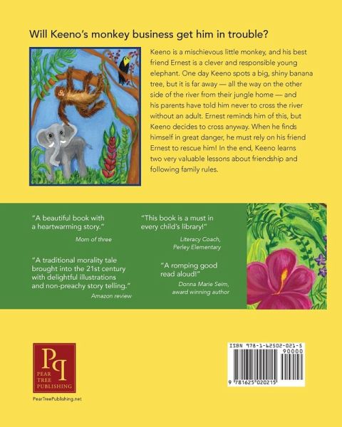 Will Keeno's Monkey Business Get Him in Trouble? Keeno is a mischievous little monkey, and his best friend in the jungle is a clever and responsible young elephant named Ernest. One day, Keeno spots a shiny new banana tree, but it is far away -- all the way on the other side of the river and his parents have told him NEVER to cross the river without an adult. Ernest reminds him of this, but Keeno decides to go anyway. When he finds himself in great danger, he must rely on his friend Ernest to rescue him! In the end, Keeno learns two very valuable lessons about friendship and following family rules.