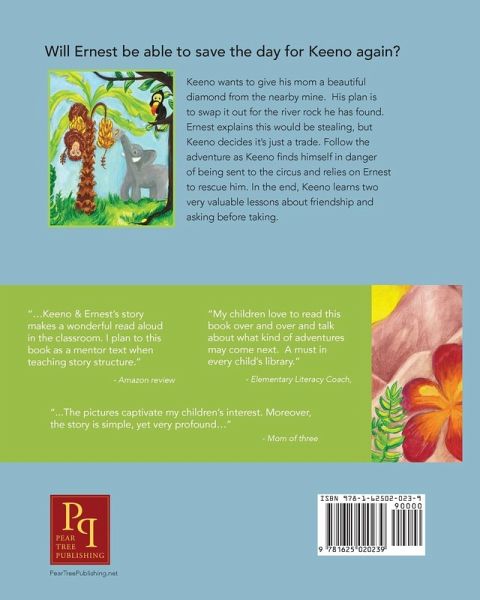 Will Ernest Save The Day For Keeno? Keeno and Ernest are the best of friends living in the jungle. Keeno, a very mischievous monkey, wants to give his mom a beautiful diamond from the diamond mine. He plans to swap it out for the river rock he found. Ernest explains that this would be stealing, but Keeno decides it is just a trade. Follow the adventure as Keeno finds himself in great danger and relies on Ernest to rescue him. In the end, Keeno learns two very valuable lessons about friendship and asking before taking.