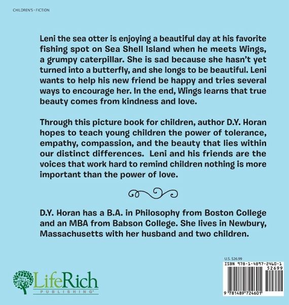 Leni the sea otter is enjoying a beautiful day at his favorite fishing spot on Sea Shell Island when he meets Wings, a grumpy caterpillar. She is sad because she hasn't yet turned into a butterfly, and she longs to be beautiful. Leni wants to help his new friend be happy and tries several ways to encourage her. In the end, Wings learns that true beauty comes from kindness and love. Through this picture book for children, author D.Y. Horan hopes to teach young children the power of tolerance, empathy, compassion, and the beauty that lies within our distinct differences. Leni and his friends are the voices that work hard to remind children nothing is more important than the power of love.
